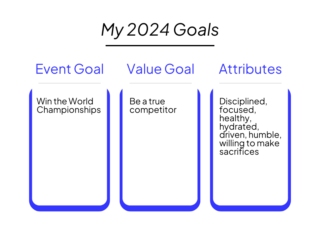 We’ve already discussed the fact that you can’t just set an Event Goal (like ‘win the World Championships’) without pairing it with a Value Goal (like ‘be a true competitor’). But how do you break down these goals so they become manageable and achievable?