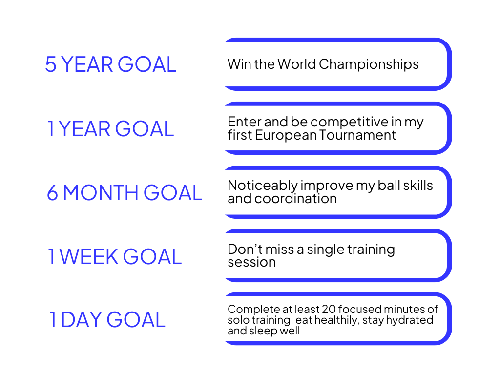 My formula is to begin with a 5-year goal and work my way down to a 1-day goal in 5 steps. It helps to write this down or use this template we've made for you. Try it for yourself. Here’s just one example of how this could look, based on my road to the Panna World Championships: